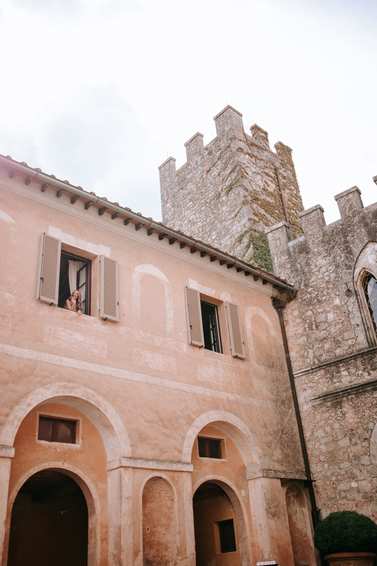 Beautiful wedding in Tuscany, Italy in an old world castle, Castello Di Celsa. Natalie and James had the most luxurious three day destination wedding event in the Tuscan Countryside with their family and closest friends. The bride wore a stunning Galialahav wedding gown.